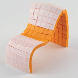 Consumer goods such as Furniture; We designed and built a functional human-scale chair: assembled configuration (top-left) and top and side-view of flat configuration (top-right). Timelapse of deploying and disassembling a chair, demonstrating the reversible actuation capability of our method.